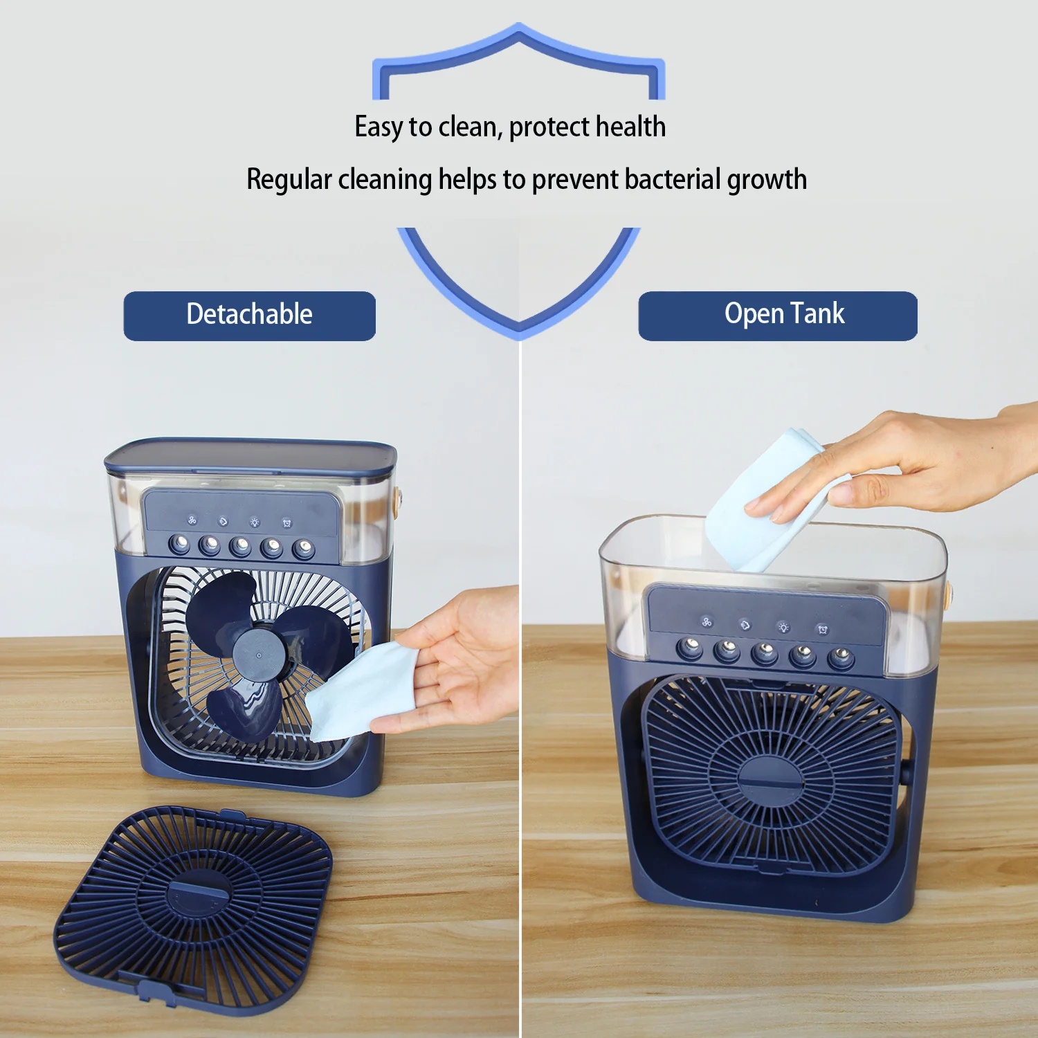 [ Timing +7 Colors Lights]Â Three automatic timing (1/2/3H), you can choose the most suitable one to enjoy your leisure time,sleeping or working timeï¼›The Mini Air Conditioner Fan built in 7 soft lights.The light can be turned off completely while the unit is running;5 large-caliber sprays;